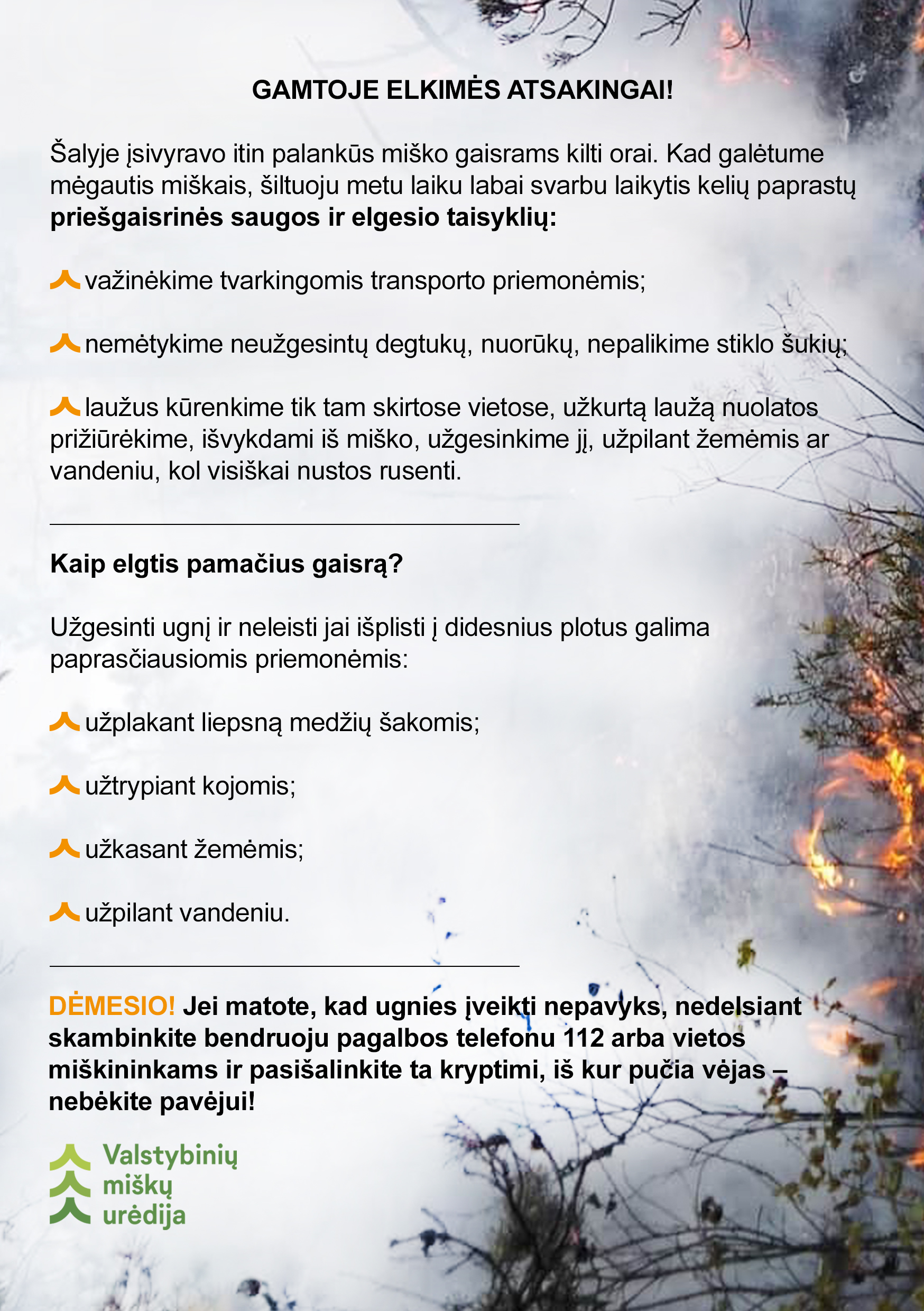 Kad galėtume mėgautis miškais, šiltuoju metu laiku itin svarbu laikytis Lankymosi miške taisyklių. Jeigu pamatėte gaisrą, užgesinti ugnį ir neleisti jai išplisti į didesnius plotus galima paprasčiausiomis priemonėmis: užplakant liepsną medžių šakomis, užtrypiant kojomis, užkasant žemėmis, užpilant vandeniu. Visgi, jei matote, kad ugnies įveikti nepavyks, nedelsiant skambinkite bendruoju pagalbos telefonu 112 arba Valstybinių miškų urėdijos miškininkams.