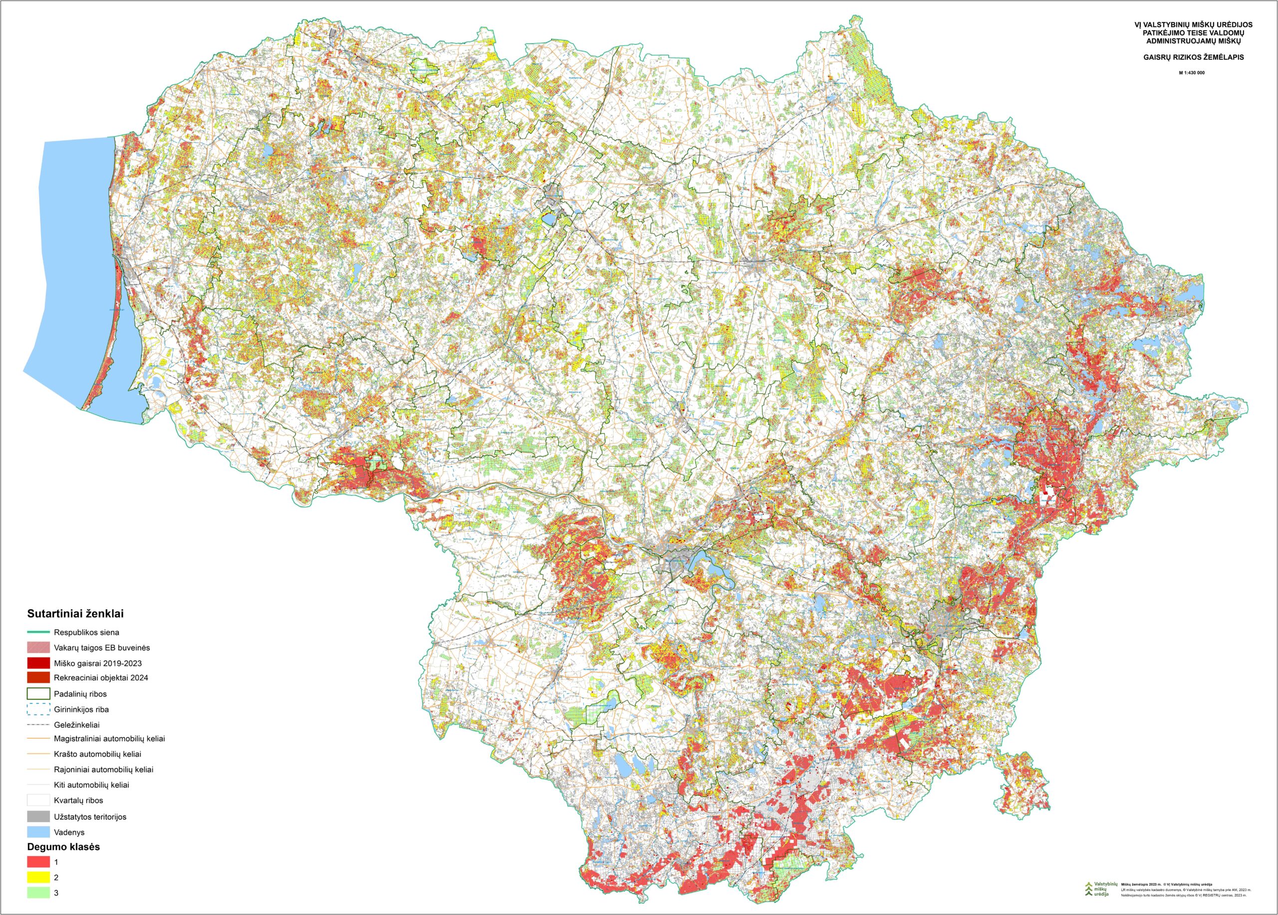 Lietuvoje vyraujanti aukšta oro temperatūra ir nedidelis kritulių kiekis – itin palankūs veiksniai miško gaisrams kilti. Valstybinių miškų urėdijos regioninių padalinių pateiktais duomenimis, šiais metais, iki gegužės 29 d., Lietuvos miškuose užregistruoti 35 miško gaisrai 6,01 ha plote, o 2023 metais tuo pačiu laikotarpiu šalyje buvo užregistruotas 61 miško gaisras 14,83 ha plote. VMU regioninių padalinių priešgaisrinės komandos bei valstybinių miškų apsaugos pareigūnai, pagal gautus pranešimus apie kilusius miško gaisrus, buvo išvykę į gaisravietes daugiau nei 75 kartus. Miškininkai, siekdami dar efektyviau organizuoti pajėgas ir užkardyti kilusius miško gaisrus, sukūrė gaisrų kilimo rizikų Lietuvos miškuose žemėlapį.