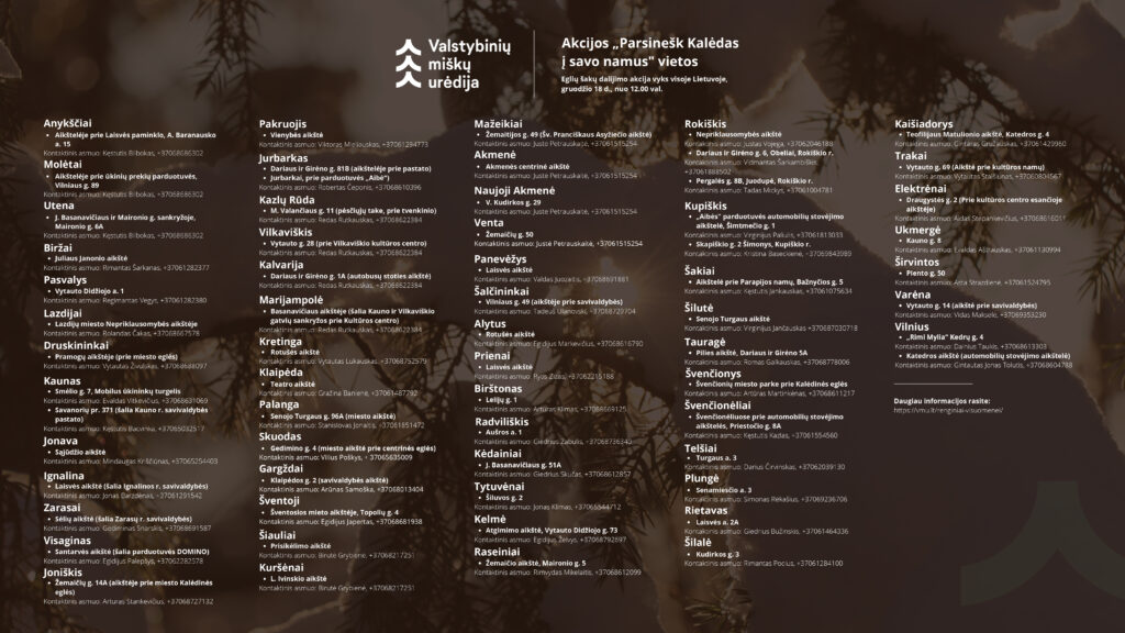 Kaip ir kasmet, norėdami pripildyti tautiečių namus šventiniu džiaugsmu bei jaukumu, gruodžio 18 d.12.00 val. Valstybinių miškų urėdijos miškininkai pagrindinėse miestų ir miestelių aikštėse bei didžiųjų prekybos centrų aikštelėse visoje Lietuvoje dovanos eglių ir pušų šakas. Šiemet eglišakių dalijimo vietų visoje Lietuvoje rekordiškai daug – net 65. Akcijos vietų sąrašą ir kontaktus galima rasti galerijoje po šiuo straipsniu.