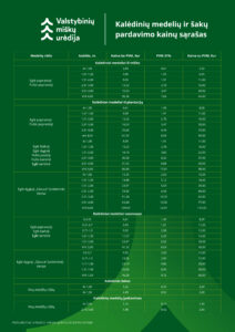 Valstybinių miškų urėdija siūlo rinktis įvairių rūšių kalėdinius medelius: baltąsias, dygiąsias, paprastąsias, serbines egles ar kėnius, paprastąsias pušis, taip pat eglių ir kitų spygliuočių šakas. Medelių kainos svyruoja nuo 3 iki 110 eurų, priklausomai nuo jų rūšies bei aukščio. Dalis parduodamų kalėdinių medelių yra išauginti urėdijos plantacijose, kuriuose jie buvo gerai prižiūrimi, suformuotos jų lajos. Dalis spygliuočių parduodami vazonėliuose. Tinkamai prižiūrint medelius vazonėliuose, juos laistant, jie gali būti persodinti ir pavasarį sėkmingai toliau augti.