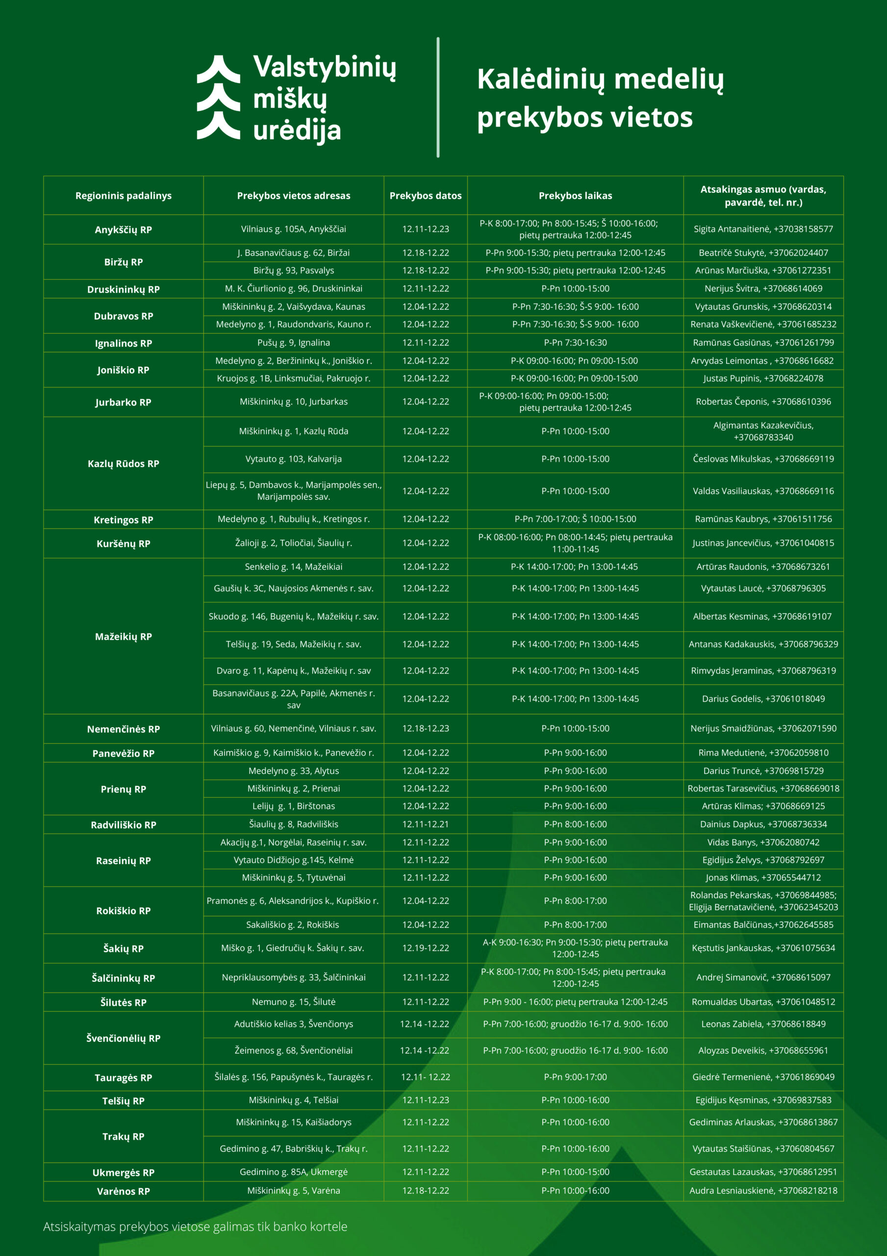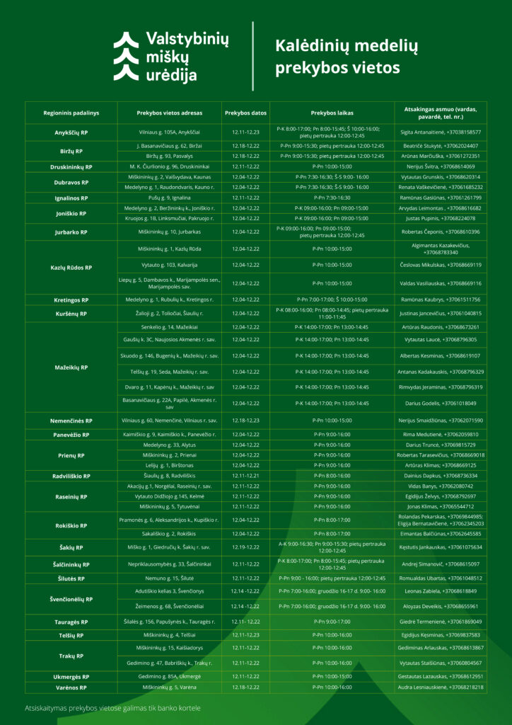 „Kasmet miškininkai gruodžio pradžioje, kai jau visi gyvename artėjančių švenčių laukimu, pradeda kalėdinių medelių prekybą. Džiaugiamės galėdami prisidėti prie šventinės nuotaikos, jaukumo sukūrimo žmonių namuose. Kviečiame įsigyti mūsų specialistų atsakingai užaugintas eglutes visuose regioniniuose padaliniuose. Taip pat artėja tradicinė mūsų akcija „Parsinešk Kalėdas į savo namus“, kuri šiemet vyks gruodžio 19 d. Jos metu miškininkai visoje Lietuvoje nemokamai dalins eglišakes, kviesdami prisidėti prie tvaraus miško išteklių naudojimo“, – sakė Valstybinių miškų urėdijos generalinis direktorius Valdas Kaubrė.